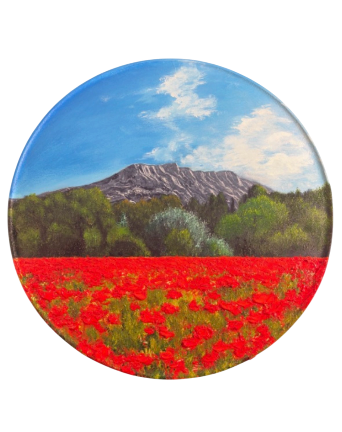 Ce tableau acrylique met en scène un vaste champ de coquelicots rouges éclatants, baigné de lumière, avec en arrière-plan la majestueuse montagne Sainte-Victoire, emblème incontournable de la Provence. Le contraste entre le rouge intense des fleurs, le vert des arbres et le bleu lumineux du ciel crée une composition vibrante et harmonieuse. Inspirée par les paysages du Sud de la France, cette œuvre évoque la chaleur, la sérénité et la beauté naturelle de la région. La texture subtile de la peinture apporte profondeur et mouvement à l’ensemble, invitant le regard à se perdre dans les détails. Idéal pour une décoration murale élégante et contemporaine, ce tableau apportera une touche de couleur et d’évasion à votre intérieur. Une pièce unique pour les amateurs d’art .